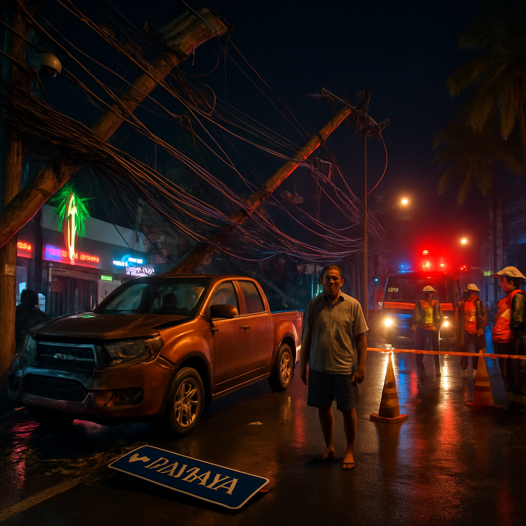 What started as a routine late-night run through Pattaya turned into a dramatic roadside spectacle on the evening of January 11, when a bronze Toyota pickup truck collided with and toppled three high-voltage power poles along Soi Paniad Chang. The crash — which occurred at precisely 10:36 p.m. in Bang Lamung district, Chon Buri — left live wires swinging across the road, forced an immediate police shutdown, and sent rescue teams scrambling to make the scene safe. Chaos on Soi Paniad Chang Onlookers described a scene that felt equal parts dangerous and surreal. The collapse of three electricity poles didn’t just block the street; it left a tangle of live power lines and communication cables dangling dangerously low, and even knocked over a directional sign. Emergency responders from the Sawang Boriboon Rescue Foundation and the Pattaya Electricity Authority moved fast, cordoning off the area to protect residents and motorists from…