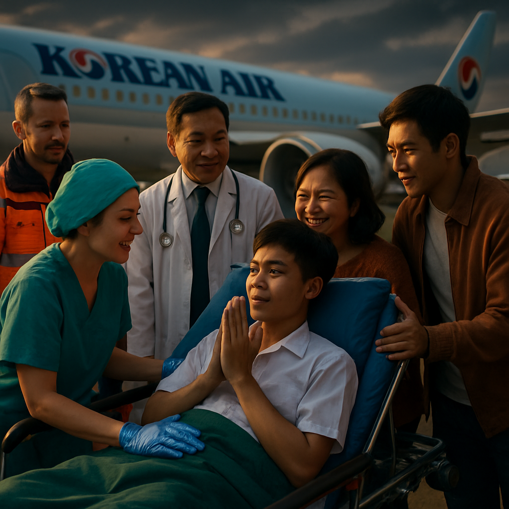 The journey from Gwangju to Bangkok was meticulously orchestrated, ensuring that Sirinya’s medical needs were prioritized every step of the way. Korean Air, showcasing its commitment to humanitarian endeavors, arranged specialized seating to accommodate Sirinya and her vital medical apparatus. This included crucial oxygen tanks, which were lovingly ensconced aboard flight KE653. As the plane touched down at Bangkok’s Suvarnabhumi Airport precisely at 11:20 PM on Saturday, the stage was set for a seamless transition to ongoing medical care in Thailand.