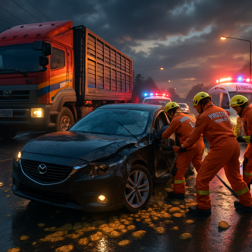 It was an invitation to disaster that the ill-fated Mazda couldn’t refuse. Unable to maintain its grip, the sedan yielded to the inertia of its own momentum, sliding disastrously into the path of Boonsong’s truck. The expressway’s attempt to cleanse itself of its fruity slip-up took a full two hours, bringing traffic to a standstill while professionals diligently managed the aftermath.